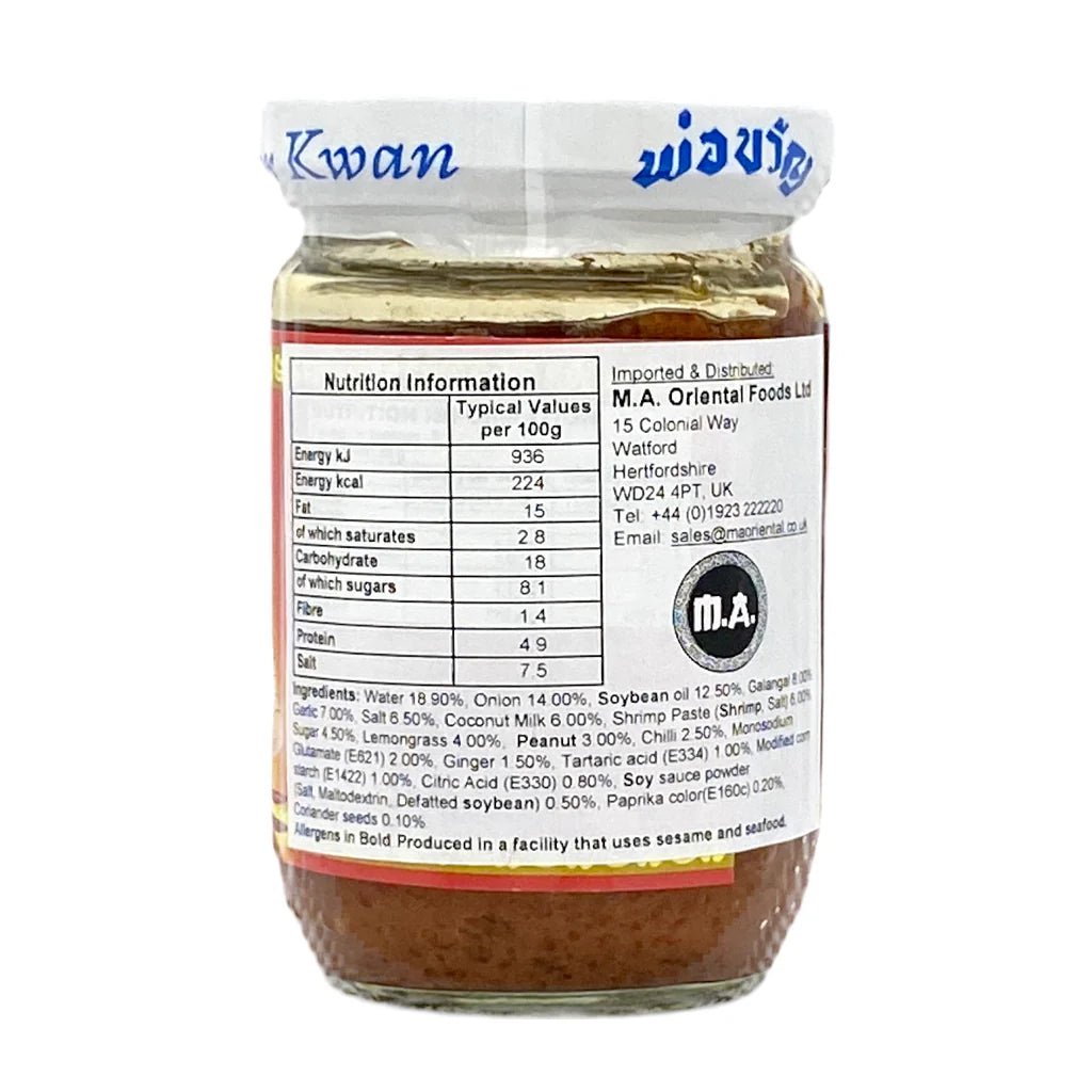 Water (18.90%), Onion (14.00%), Soybean Oil (12.50%), Galangal (8.00%), Garlic (7.00%), Salt (6.50%), Coconut Milk (6.00%), Shrimp Paste (contains shrimp), Sugar, Lemongrass, Peanut, Chili, MSG (E621) (2.00%), Ginger (1.50%).